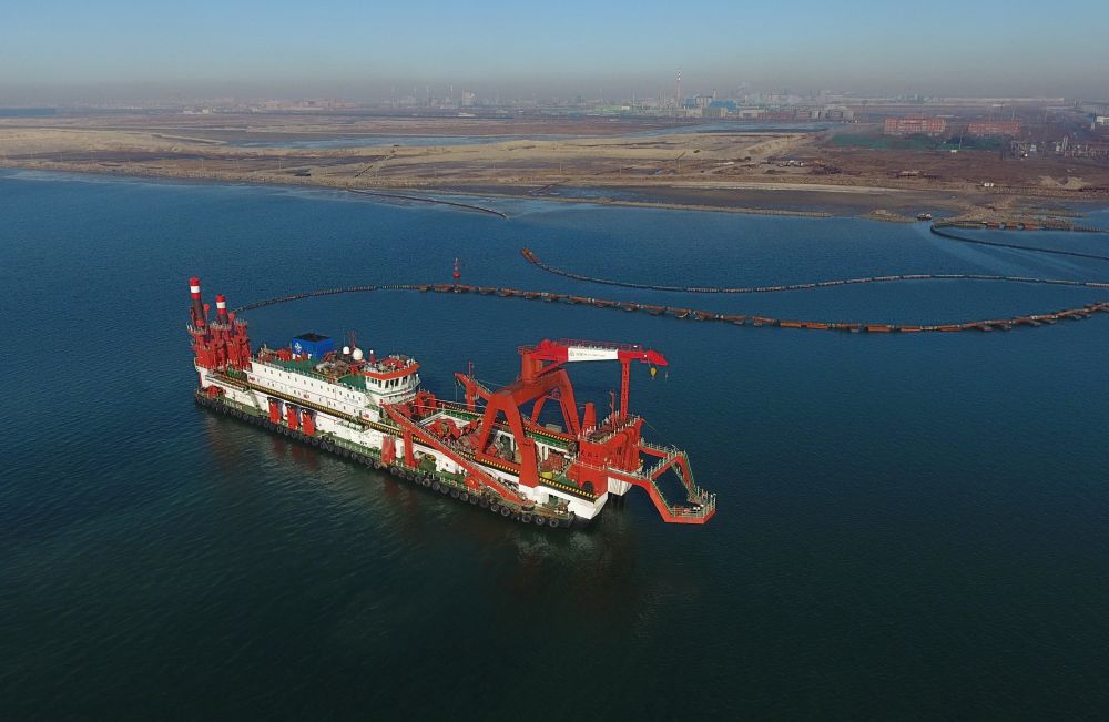 3月14日,一艘施工船在唐山港京唐港區25萬噸級航道工程海域施工作業(無人機拍攝)。新華社記者楊世堯攝