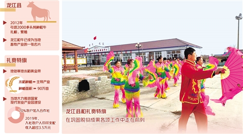 龍江縣是著名的雜糧產區、畜牧大縣。如今,龍江和牛已成為龍江縣畜牧產業的一張名片,帶領群眾走上致富路?!拔覀冄芯恐贫恕陡邫n肉牛優勢特色產業集群建設方案》,從2016年起出臺了扶持政策?!饼埥h委副書記孫立軍告訴記者,當地引導企業與農戶合作養牛,農戶每購買兩頭母牛,政府會給予一定的補貼款。此外,政府還向企業采購凍精幫助農戶繁育小牛,小牛犢生長到6個月達標后,由企業統一收購,價格在1.2萬元至1.4萬元不等。