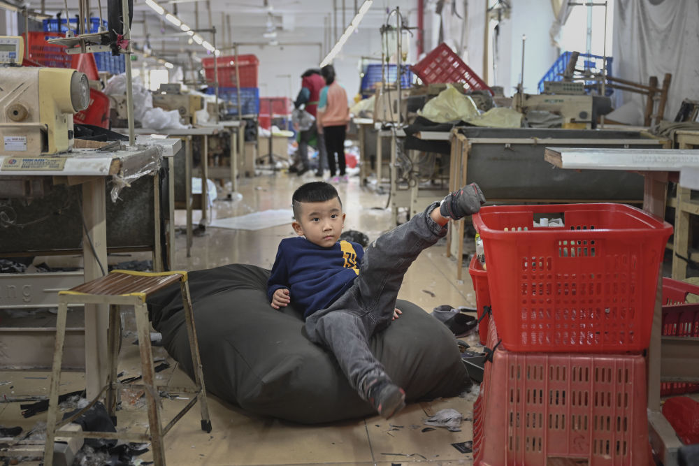 1月26日,在福建省石獅市的金利萊斯服裝廠,聰聰和黃海龍在一起。