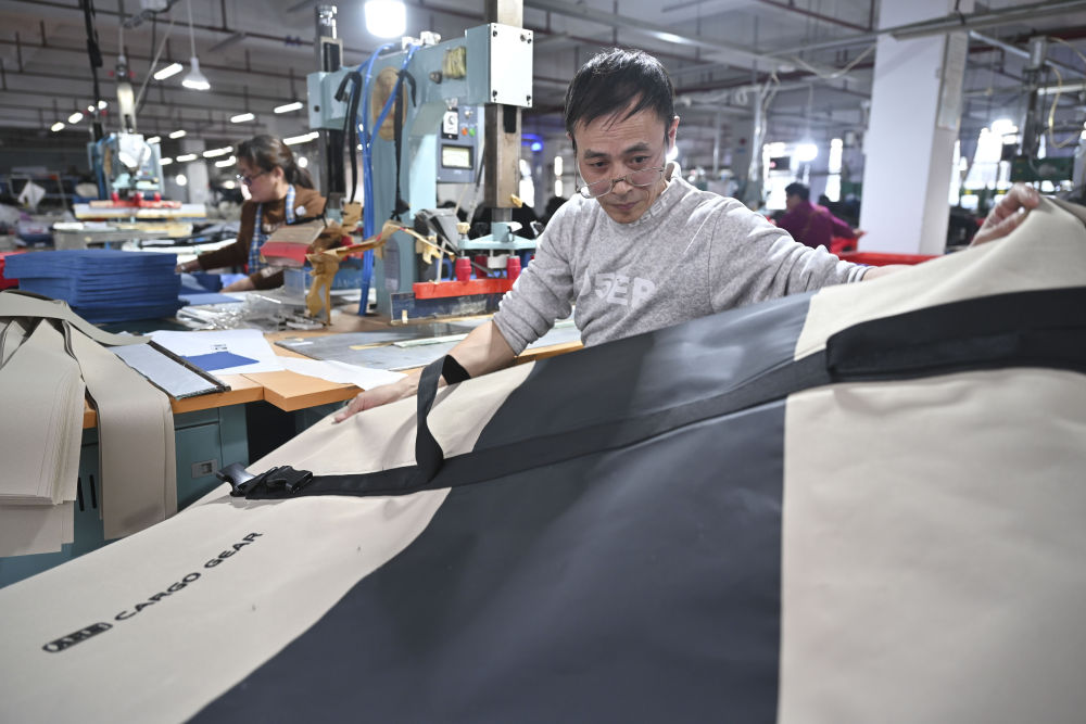 1月22日,張良國在制作防水包。