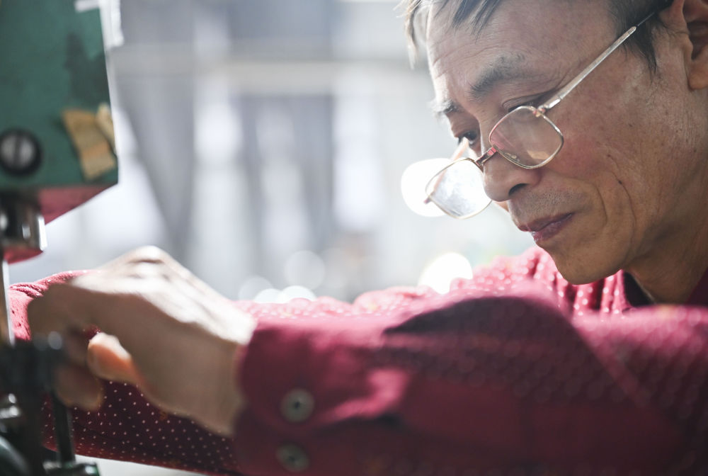 1月26日,聰聰戴上媽媽用工廠邊角余料為老家的奶奶縫制的袖套。