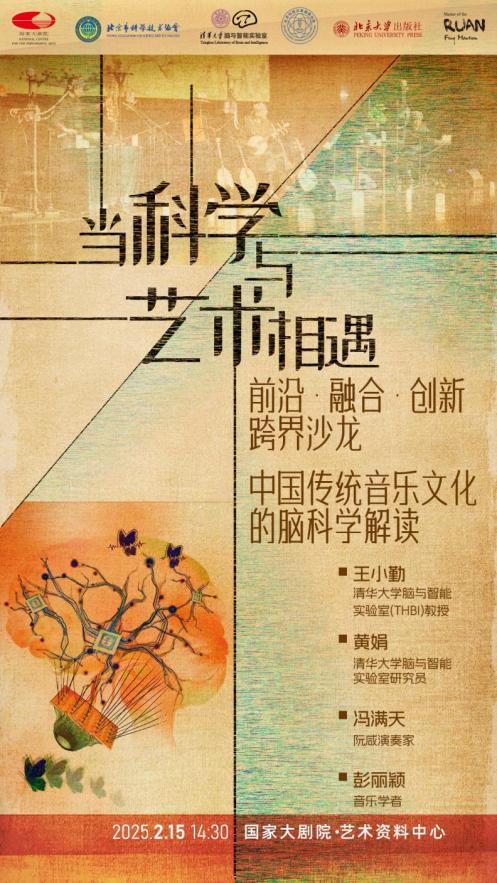 2月15日,一场主题为“中国传统音乐文化的脑科学解读”的沙龙活动在国家大剧院举办。此次“前沿·融合·创新沙龙”是“当科学与艺术相遇”系列活动的延续,是国家大剧院、北京市科协、北京科技记协、北京大学出版社继“当科学与艺术相遇——科学元典名篇赏读沙龙”系列活动之后,推出的又一个科学与艺术跨界系列活动。该系列沙龙聚焦科技与艺术的融合创新,清华大学脑与智能实验室教授王小勤及研究员黄娟、阮咸演奏家冯满天、古乐器研究学者彭丽颖等嘉宾通过学术分享与艺术实践,共同探讨中国传统音乐在脑科学研究中的独特价值。