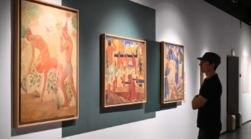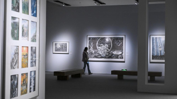 4月15日,在英国首都伦敦,一名女子在维多利亚与阿尔伯特博物馆东馆媒体日活动上观看影片。
