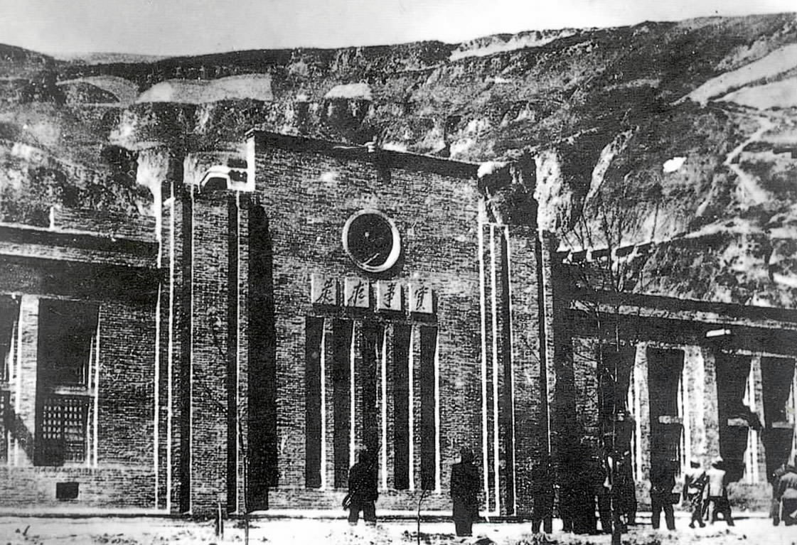 这是1943年11月落成的延安中共中央党校大礼堂,正面墙上镌刻着毛泽东的题词“实事求是”(资料照片)。新华社发