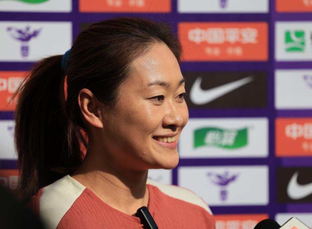 1月6日,中国女足队员吴海燕在训练场边接受采访。新华社记者 毛思倩 摄