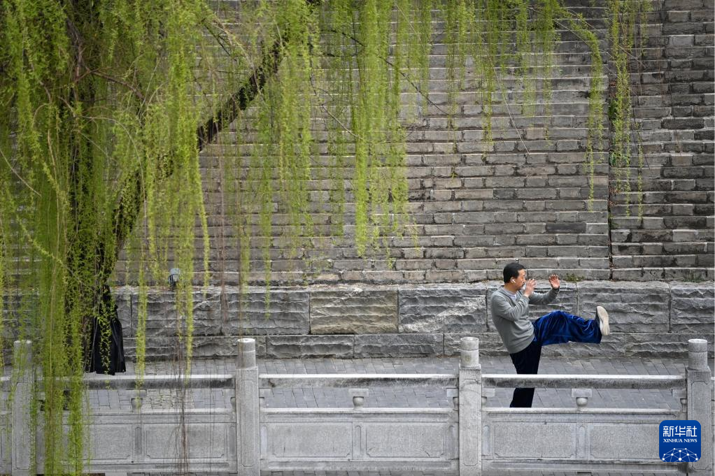 3月20日,市民在西安城墙环城公园和平门至建国门段练习武术。