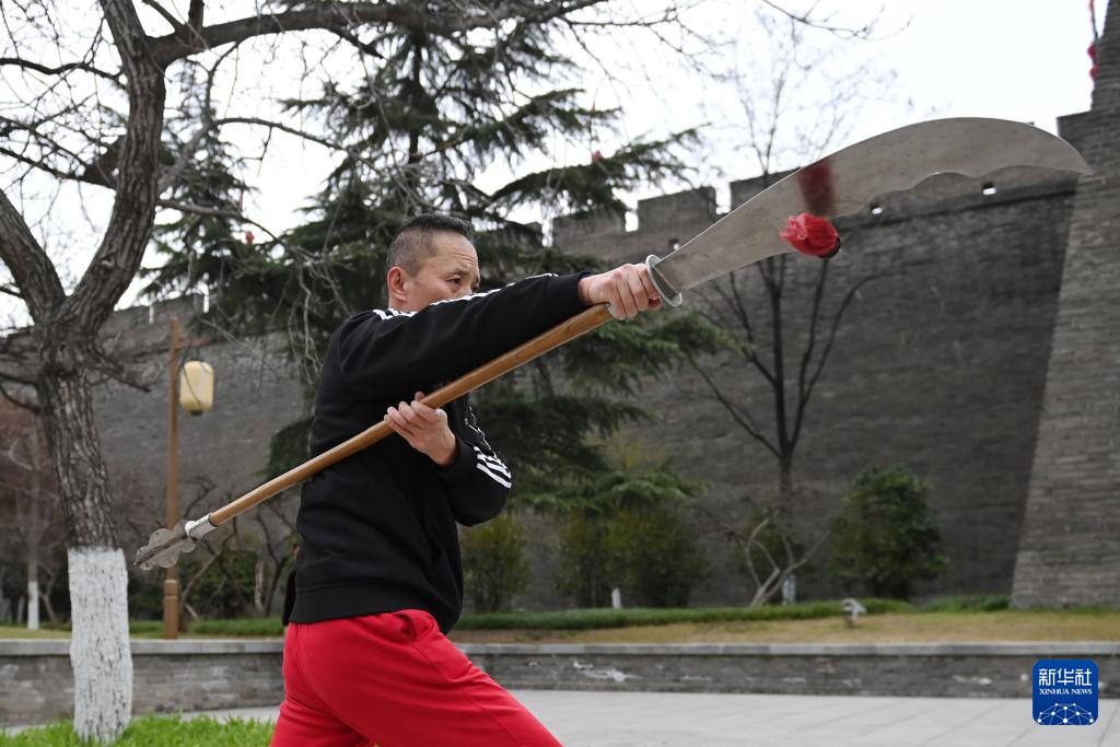 3月19日,市民在西安城墙环城公园玉祥门至安定门段练习武术。