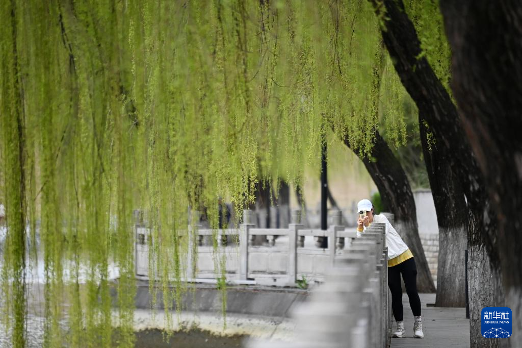 3月19日,一位晨跑的市民在西安城墙环城公园玉祥门至安定门段护城河畔拍摄春柳。