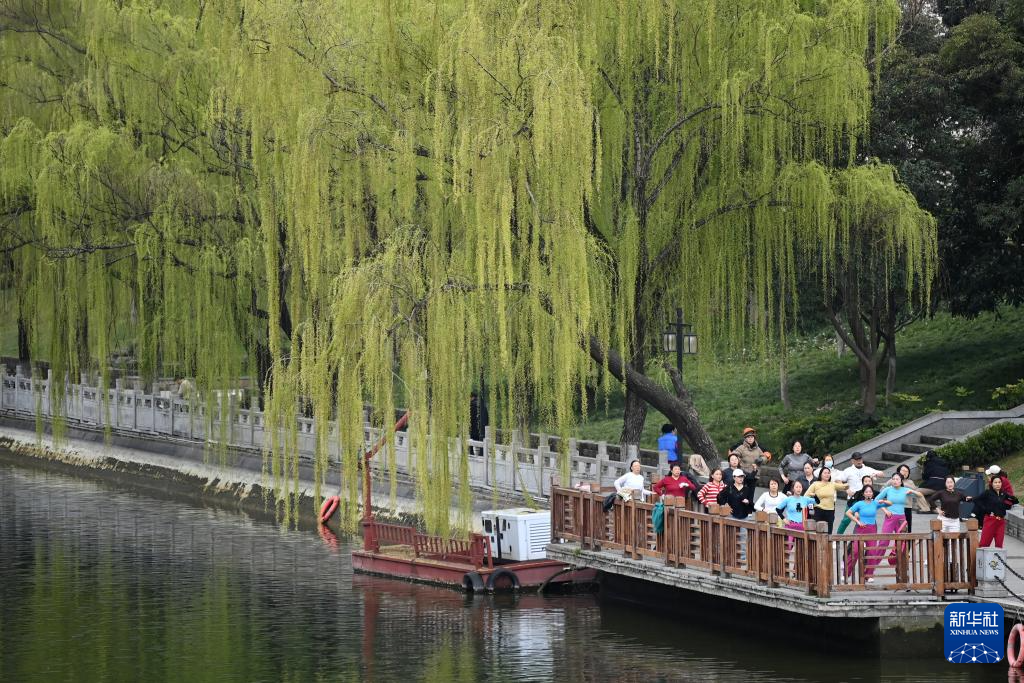 3月19日,市民在西安城墙环城公园玉祥门至安定门段的护城河畔跳健身操。