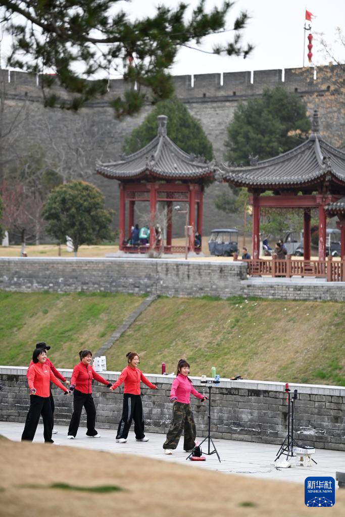 3月19日,市民在西安城墙环城公园玉祥门至安定门段跳健身操。
