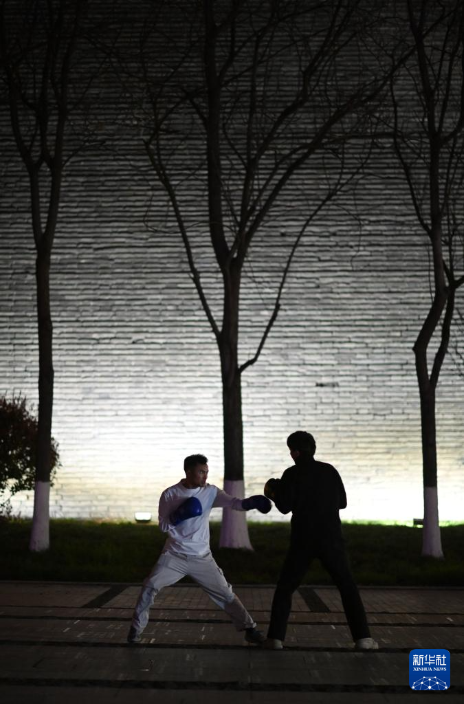 3月19日,市民在西安城墙下的环城公园玉祥门至西北城角段练习拳击。