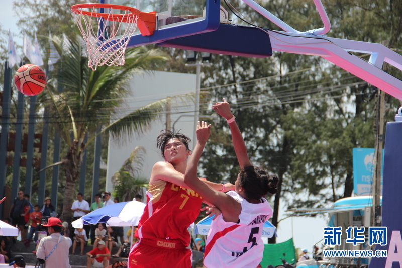 ??? 11月16日,中國沙灘籃球運動員黃銀婷(左)在比賽中。中國體育代表團16日在泰國普吉舉行的第四屆亞洲沙灘運動會上勇奪2枚金牌和2枚銅牌。當天比賽全部結束時,中國隊以3金2銀5銅的成績暫列獎牌榜第五。新華社發(塔納攝)
