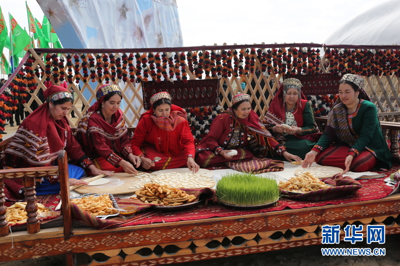 ????以往過著游牧和半游牧生活的人們在冰雪消融、牲畜產仔的時節,都會以這一傳統佳節歡慶新生活。 21日上午,在阿什哈巴德以東40來公里處專門為節日搭建的場地上,土庫曼斯坦內閣、外交使節、民眾和學生參加了隆重的慶祝活動。活動中,青年男女、學齡前兒童載歌載舞,民眾和藝術家展示傳統的編織和手工藝術,青年男女高高地蕩起秋千,汗血寶馬進行馬技表演,土庫曼咬狼犬、羊群和駱駝或圍在欄子里,或被主人牽在手中,展現出游牧民族的生活景象。