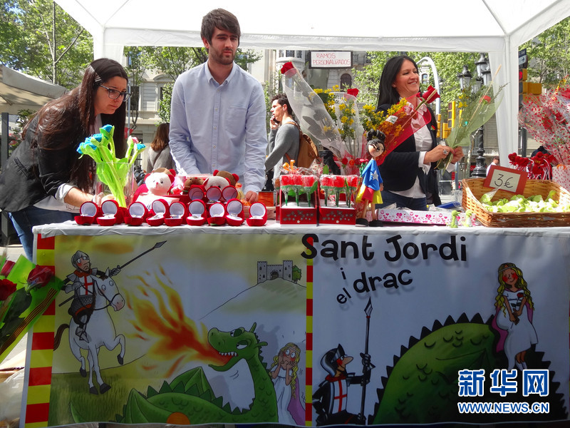 今年的“圣喬治節(jié)”是個(gè)天空晴朗陽光燦爛的日子,在巴塞羅那市中心的加泰羅尼亞廣場及周邊街道上,臨時(shí)搭建起了很多賣書和賣花的攤位。大街上到處可以見到手持鮮花的女士,或者拿著書的男士。