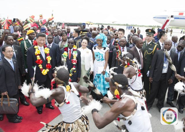 上午10時15分左右,專機降落,習(xí)主席和夫人彭麗媛走下旋梯。奏中津兩國國歌,鳴21響禮炮,檢閱儀仗隊,當(dāng)?shù)貎和I(xiàn)花環(huán)和鮮花……前來迎接的津巴布韋總統(tǒng)穆加貝,為習(xí)主席舉行了隆重的歡迎儀式。