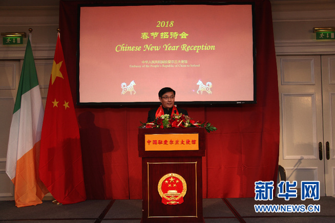 岳曉勇大使在致辭中表示,2018年春節是中國共產黨十九大勝利召開后的第一個春節,也是中國人民在以習近平同志為核心的黨中央領導下邁入中國特色社會主義新時代的第一個春節。值此新春佳節來臨之際,中國駐愛使館向長期致力于中愛友好的的各界人士表示誠摯的問候和新春祝福。2017年,中愛關系取得了令人欣喜的進展。雙方高層互訪保持頻繁;兩國貿易和投資大幅增長,雙邊貿易同比增長36.7%,愛爾蘭對華投資同比增長3.5倍;兩國在教育、科技、文化等領域的交流與合作也邁上了新臺階,愛爾蘭政府已決定將漢語納入該國的高考課程。