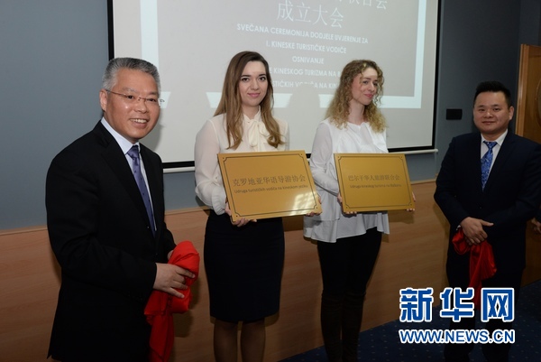 4月11日,中國駐克羅地亞大使胡兆明(左一)與克羅地亞華語導游協會會長蔣曉亮(右一)在薩格勒布為當天成立的克羅地亞華語導游協會和巴爾干華人旅游協會揭牌。新華社記者高磊 攝