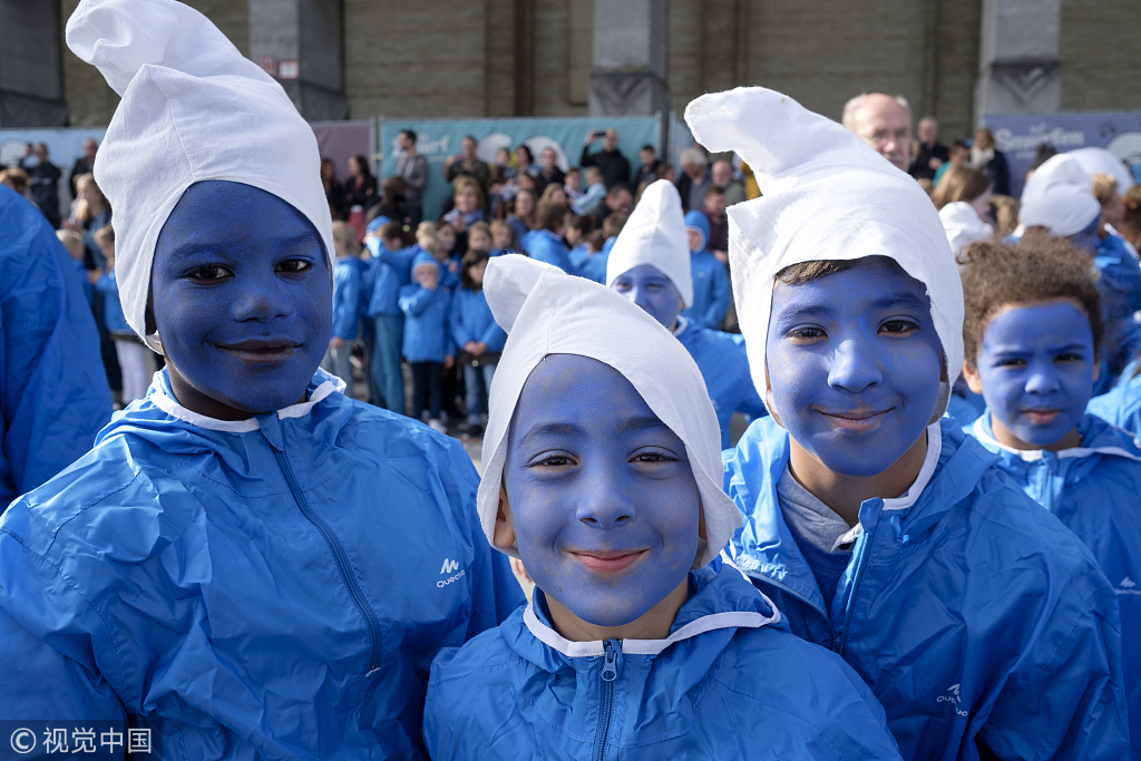 當地時間2018年10月23日,比利時布魯塞爾,民眾參加動畫形象“藍精靈”60歲慶祝活動。(圖片來源:視覺中國)