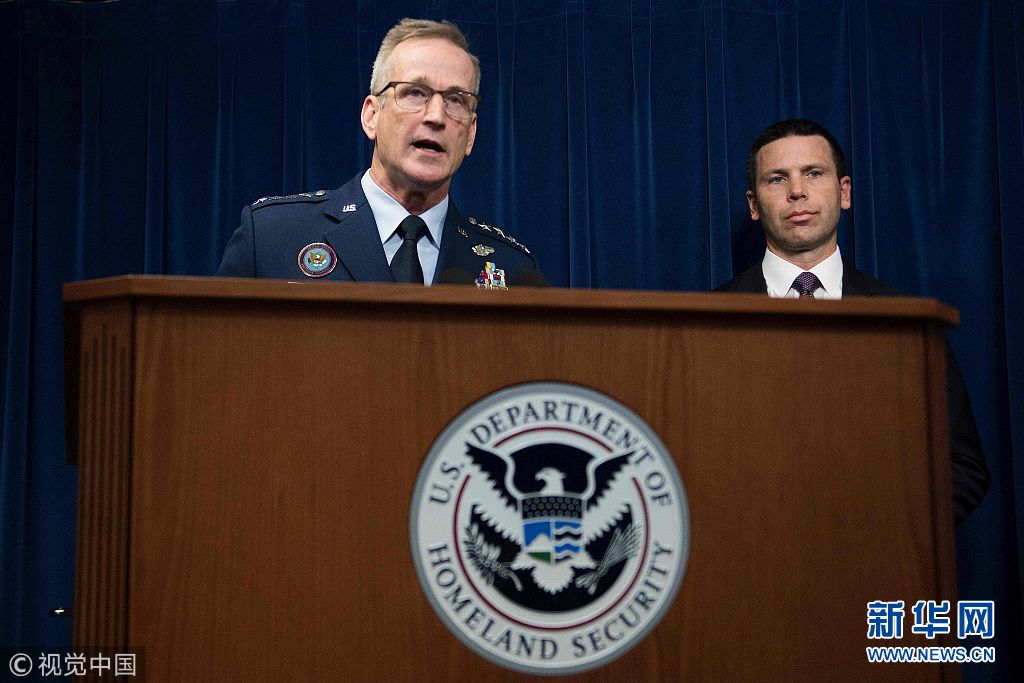 當地時間2018年10月29日,美國華盛頓,美軍北方司令部司令奧肖內西、美國海關和邊境保護局長凱文·麥卡利南舉行記者會。奧肖內西29日宣布,美軍將派遣5200名現役士兵前往南部邊境,應對中美洲移民潮。近日,數千名來自洪都拉斯、危地馬拉和薩爾瓦多等中美洲國家的民眾穿越邊界進入墨西哥。他們或步行、或乘坐大篷車北上,有意穿越墨西哥前往美國。(圖片來源:視覺中國)