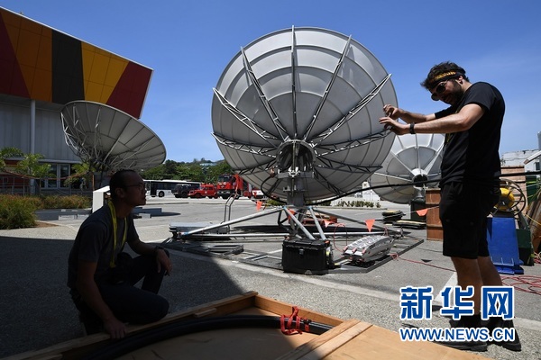 11月13日,工作人員在巴布亞新幾內亞首都莫爾茲比港的APEC國際媒體中心安裝衛星設備。 新華社記者呂小煒攝