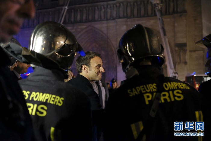 4月15日,在法國巴黎,法國總統(tǒng)馬克龍(中)在火災(zāi)現(xiàn)場視察。新華社發(fā)(亞歷山大·卡曼 攝)