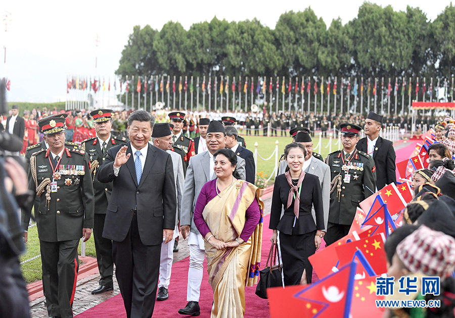 10月12日,國(guó)家主席習(xí)近平乘專機(jī)抵達(dá)加德滿都,開(kāi)始對(duì)尼泊爾進(jìn)行國(guó)事訪問(wèn)。尼泊爾總統(tǒng)班達(dá)里在機(jī)場(chǎng)為習(xí)近平舉行具有濃郁尼泊爾民族特色的歡迎儀式。 新華社記者 高潔 攝