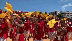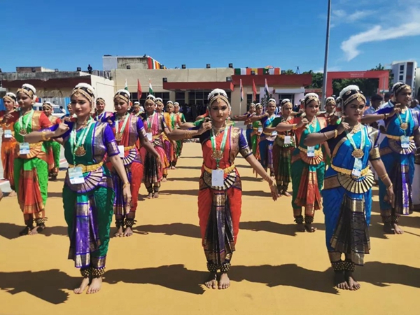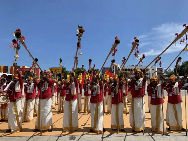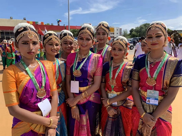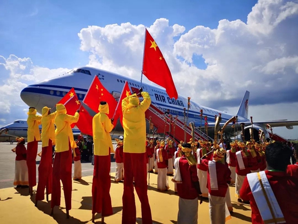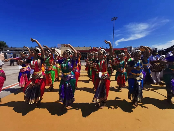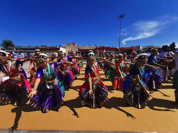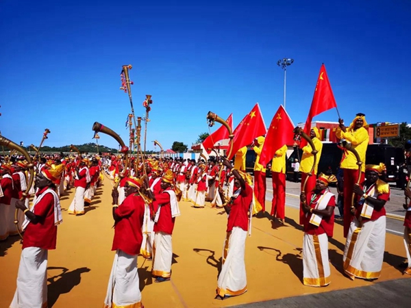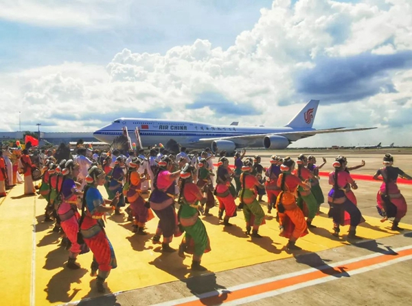 民眾們載歌載舞,有人跳起婆羅多舞,有人踩高蹺、劃旱船,盛情歡迎習主席的到來。