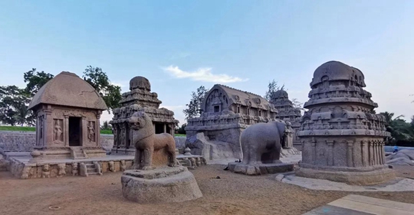 五戰車神廟于公元7世紀所建,均由整塊花崗巖從上至下鑿刻而成。每座建筑形態各異,分別代表印度史詩《摩訶婆羅多》中的五位王子和黑公主的座輦。1984年列入聯合國世界文化遺產名錄。新華社記者王曄攝