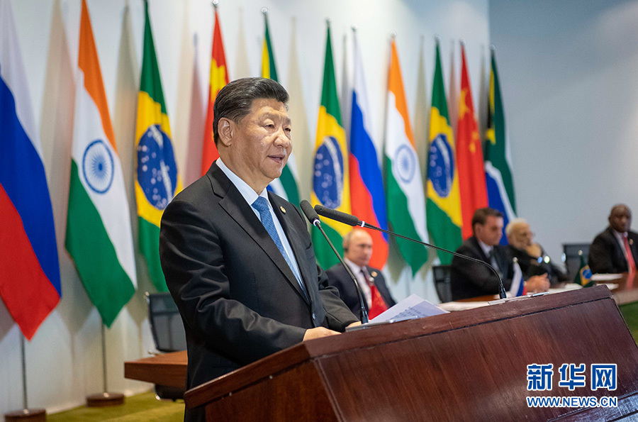 當(dāng)?shù)貢r(shí)間11月14日,金磚國(guó)家領(lǐng)導(dǎo)人同金磚國(guó)家工商理事會(huì)和新開(kāi)發(fā)銀行對(duì)話會(huì)在巴西利亞舉行。中國(guó)國(guó)家主席習(xí)近平、巴西總統(tǒng)博索納羅、俄羅斯總統(tǒng)普京、印度總理莫迪、南非總統(tǒng)拉馬福薩共同出席。這是習(xí)近平發(fā)表講話。 新華社記者 王曄 攝