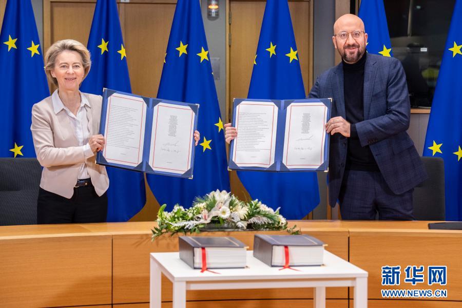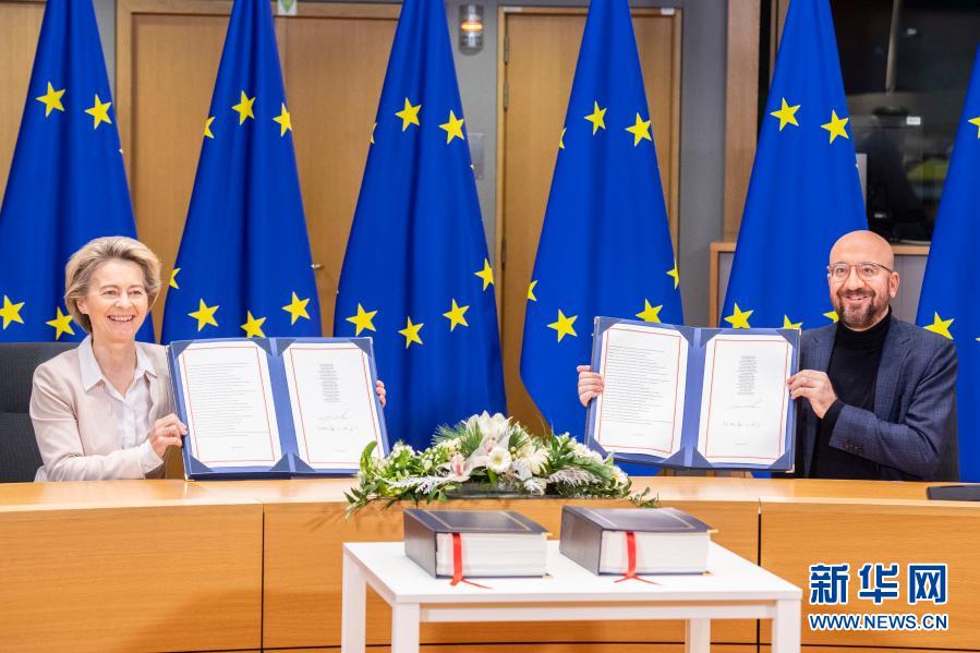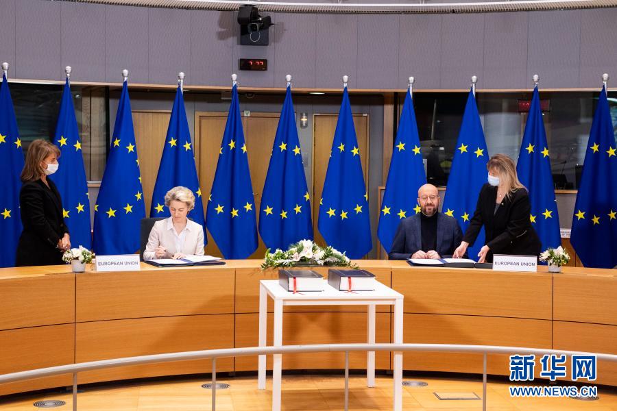 12月30日,在比利時(shí)布魯塞爾的歐盟總部,歐洲理事會(huì)主席米歇爾(右)和歐盟委員會(huì)主席馮德萊恩(左)出席簽署儀式。新華社發(fā)(歐盟供圖)