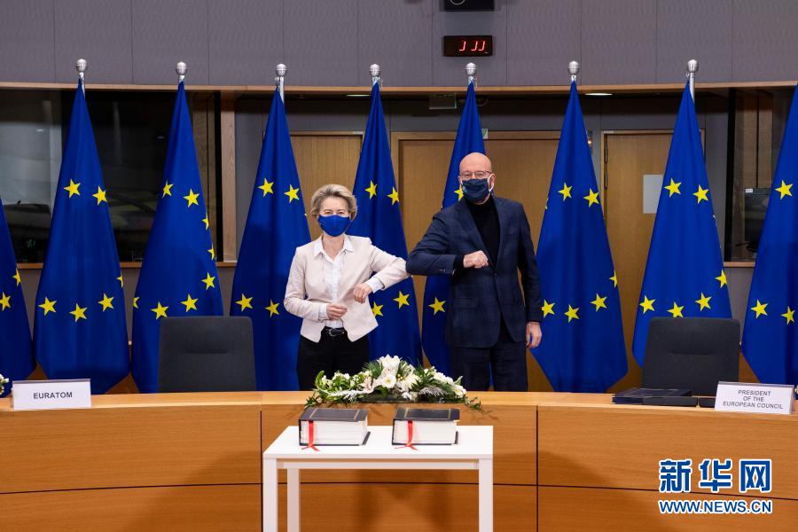 12月30日,在比利時(shí)布魯塞爾的歐盟總部,歐洲理事會(huì)主席米歇爾(右)和歐盟委員會(huì)主席馮德萊恩(左)出席簽署儀式時(shí)碰肘致意。新華社發(fā)(歐盟供圖)
