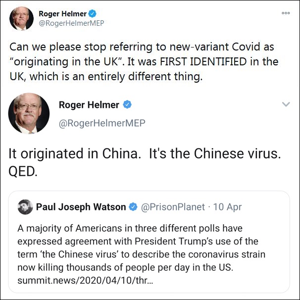 英國出現(xiàn)變異新冠病毒后,世衛(wèi)組織(WHO)將起源地列為英國,不少主流媒體也引用了相關(guān)言論。但這讓英國右翼政黨獨立黨(UKIP)成員,曾擔任歐洲議會議員羅杰·赫爾默坐不住了。