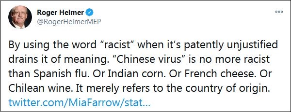 不料,這條評論徹底“翻車”。赫爾默是一名英國獨立黨成員,政治立場偏保守,批評英國的國家醫(yī)療服務(wù)體系(NHS),并否定歐盟的氣候政策。過去一年間,他曾多次將新冠病毒污蔑為“中國病毒”,還曾轉(zhuǎn)發(fā)過特朗普的相關(guān)視頻。