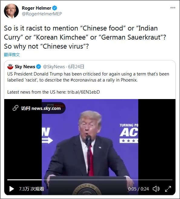 6月24日,赫爾默轉(zhuǎn)發(fā)了特朗普集會上喊“功夫病毒”的視頻,并評論稱:“說中國菜、印度菜、韓國泡菜或德國酸菜是種族歧視嗎?那么,為什么‘中國病毒’(是呢)?”