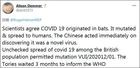 赫爾默在28日的推特中寫道:“我們能停止將變異新冠病毒稱為‘在英國起源’嗎?它(病毒)只是在英國發(fā)現(xiàn),這(和英國起源)完全是兩碼事。”