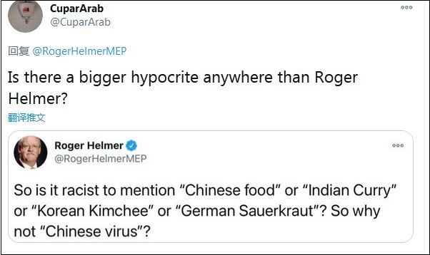 不少網(wǎng)友指出了赫爾默的雙標。“議員先生,你管這(新冠病毒)叫‘中國病毒’,為什么不也把它叫做英國病毒?”