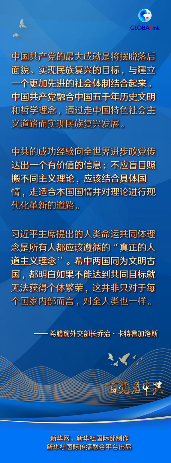 在中共百年華誕之際,卡特魯加洛斯向中國共產黨和中國人民送上祝福:“我相信中國人民取得的這些矚目成就還將繼續下去,相信中國共產黨的下一個百年能給中國人民帶來更加光明和美好的未來?!?/p>