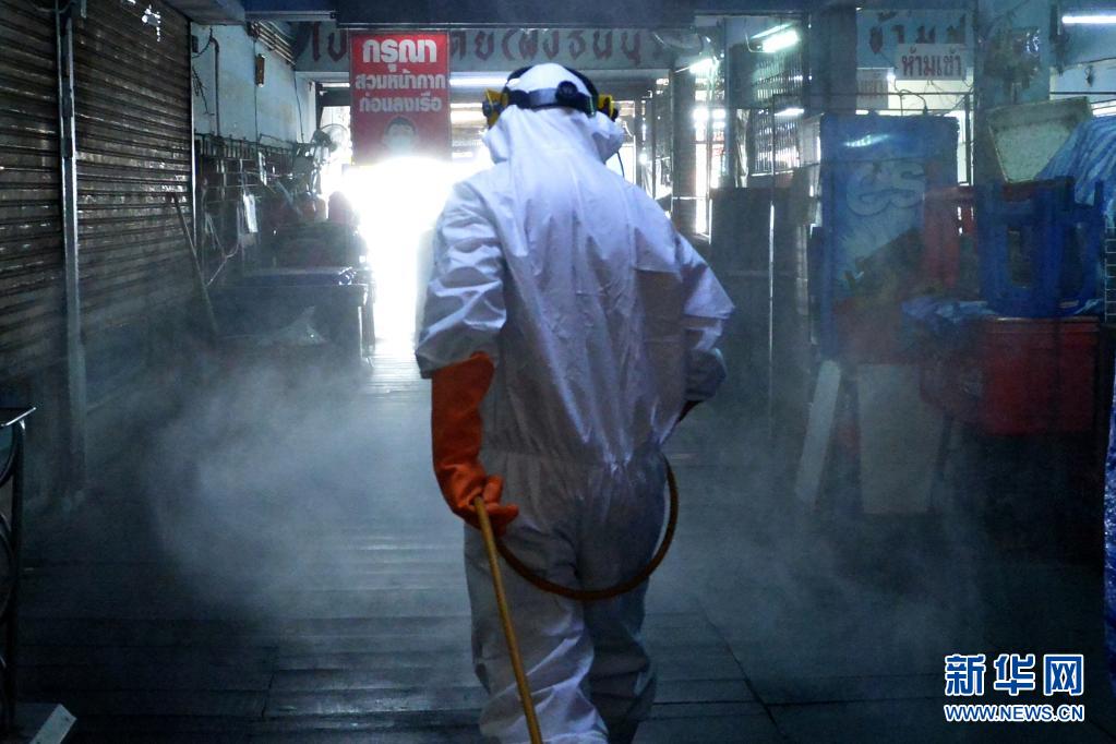 6月21日,工作人員在泰國(guó)首都曼谷一處生鮮市場(chǎng)進(jìn)行消毒。