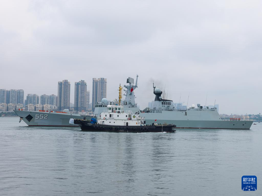 4月19日上午,俄罗斯海军舰艇编队结束为期5天的友好访问,驶离广东湛江某军港。这是中国海军郴州舰率先驶离码头引导俄方舰艇离港。新华社发(李俊霖 摄)